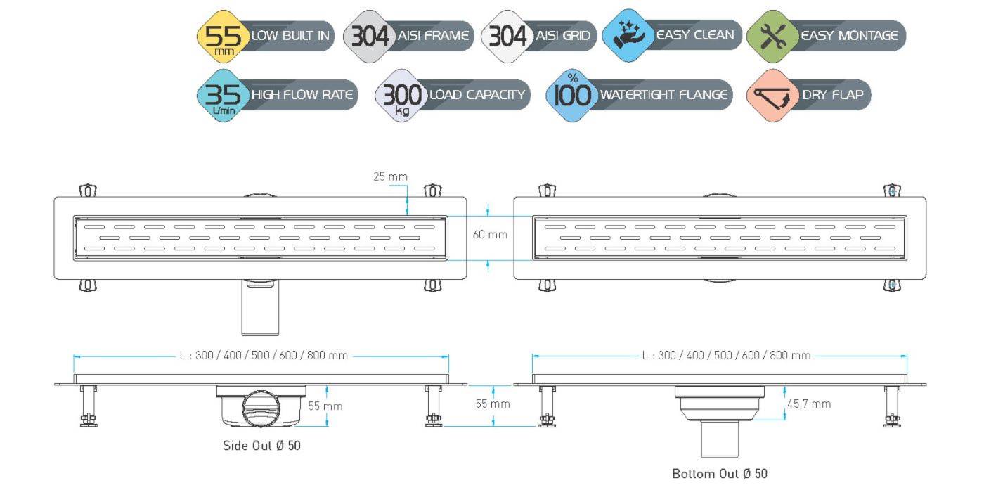 ניקוז מקלחת מיוצר בגדלים שונים. בהתאם לצרכים שלך אנו מציעים גדלים הבאים: 300 מ"מ, 400 מ"מ, 500 מ"מ, 600 מ"מ ו 8000 מ"מ.