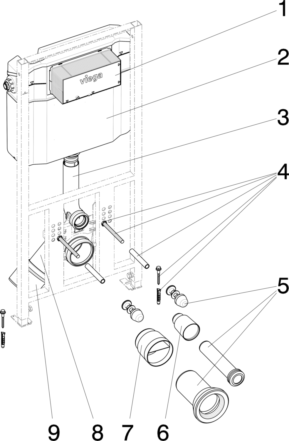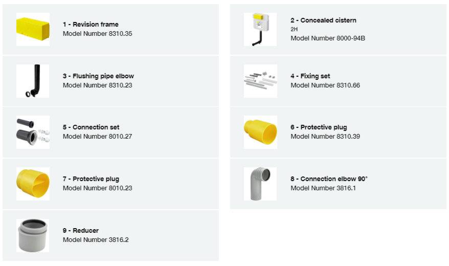 powder-coated steel frame, concealed cistern 2H, WC connection elbow DN90 (depth-adjustable) made of PP, eccentric adapter DN90/100 made of PP, WC connection fitting, fixing material for element (for floor) and ceramic, screws (self-drilling) for fixing to metal support profiles, hole Ø 11 mm for fixing in wooden frame construction or application of fixing element for support arm (model 8169.2), alignment help