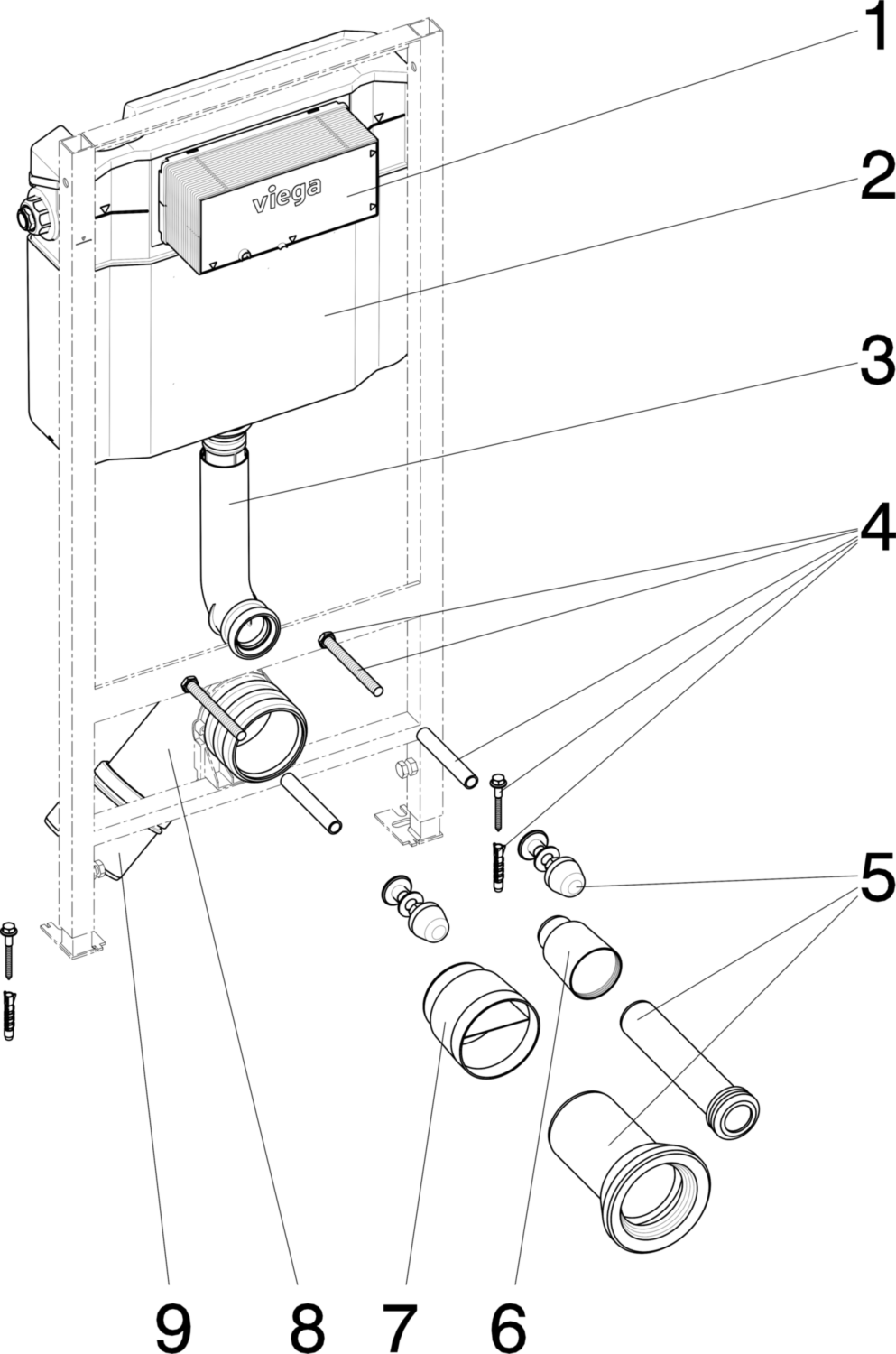 powder-coated steel frame, concealed cistern Standard 2S, WC connection elbow DN90 (depth-adjustable) made of PP, eccentric adapter DN90/100 made of PP, WC connection fitting, fixing material for element (for floor) and ceramic, screws (self-drilling) for fixing to metal support profiles, hole Ø 11 mm for fixing in wooden frame construction