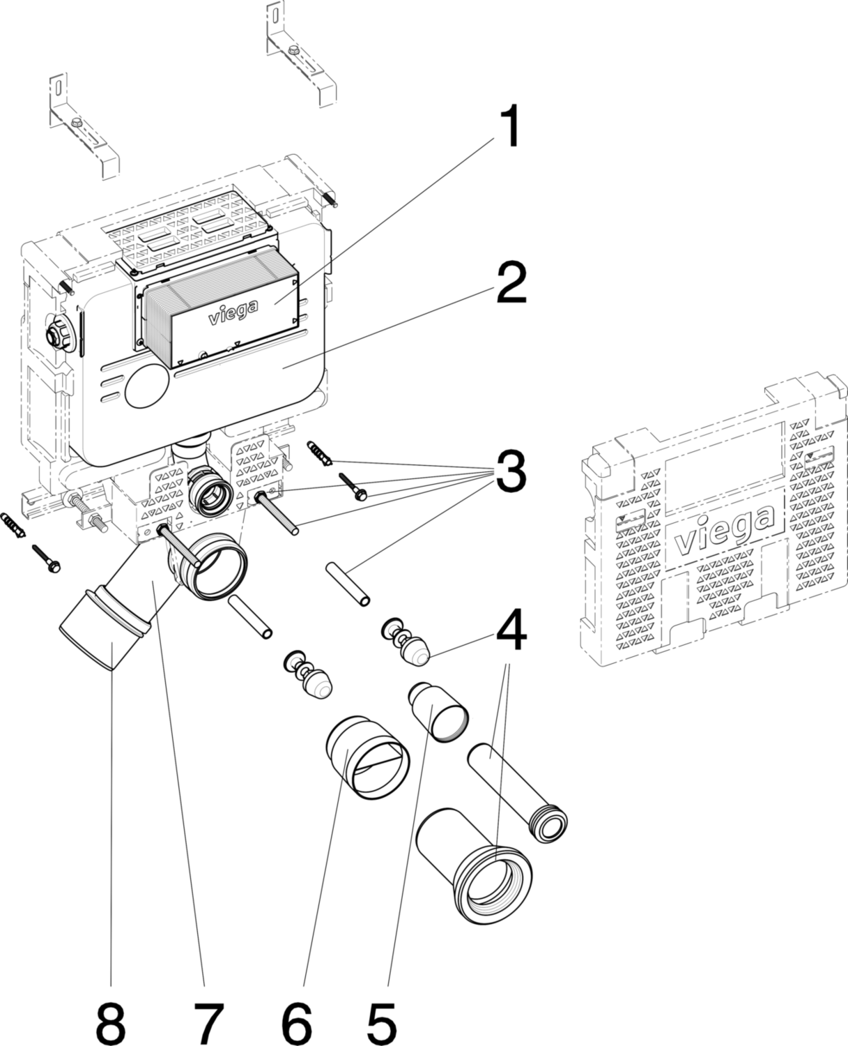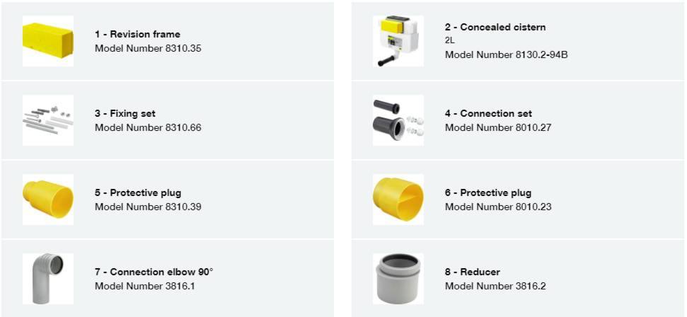 concealed cistern 2L, WC connection elbow DN90 made of PP, eccentric adapter DN90/100 made of PP, WC connection fitting, sound insulating EPS casing, fixing material for block and ceramic